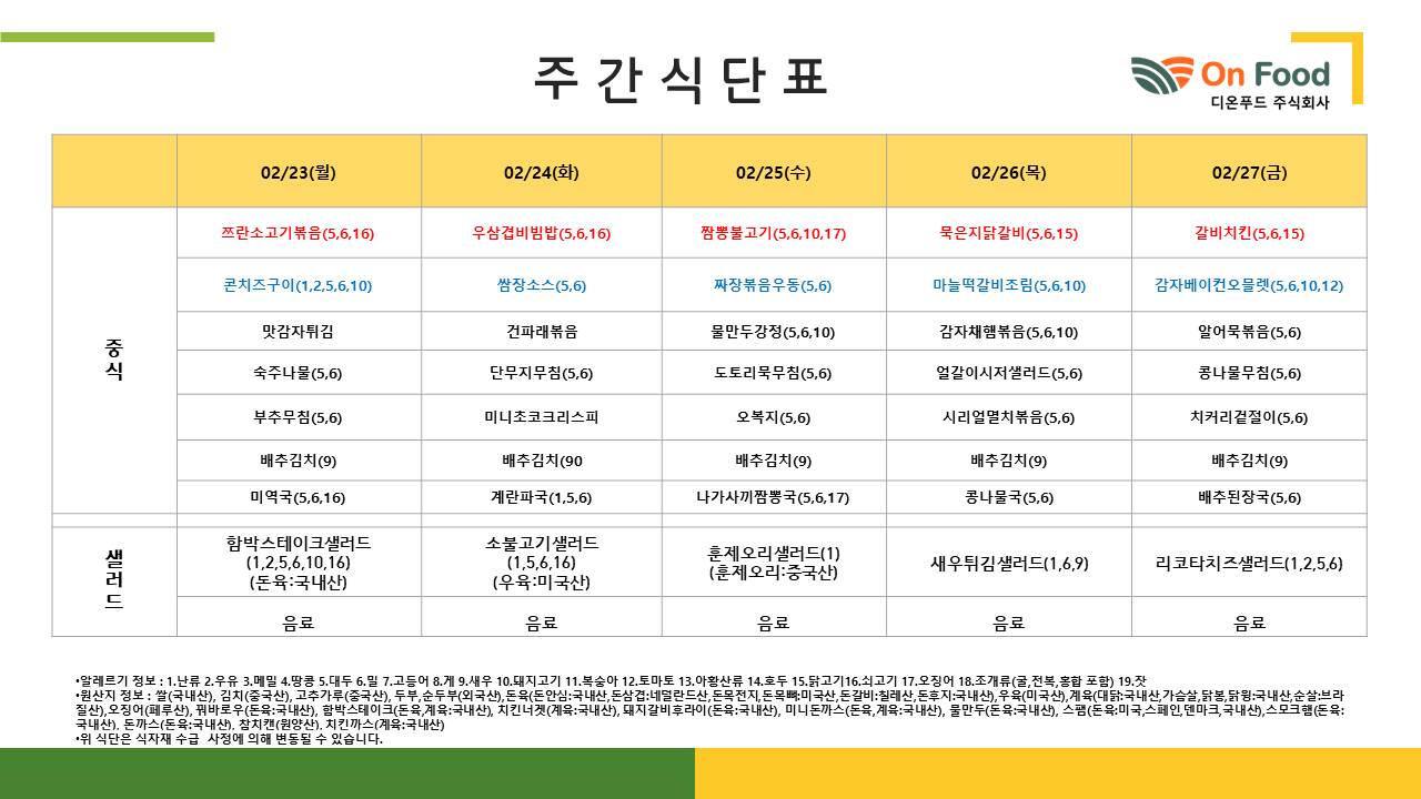 2월 23일(월)~ 2월 27일(금) 급식메뉴 안내